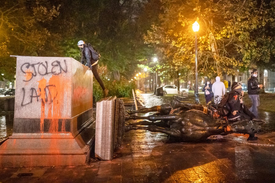 “As the group [of protesters] came into the Southwest Park blocks, they put straps and chains around the Teddy Roosevelt statue and pulled it down using a vehicle,” Lovell said. “According to Portland Parks & Recreation, that statue has been there for almost a century. The crowd then turned its attention to the Abraham Lincoln statue and Park and Madison — that statue dates back to 1928 and was also pulled down the ground.”