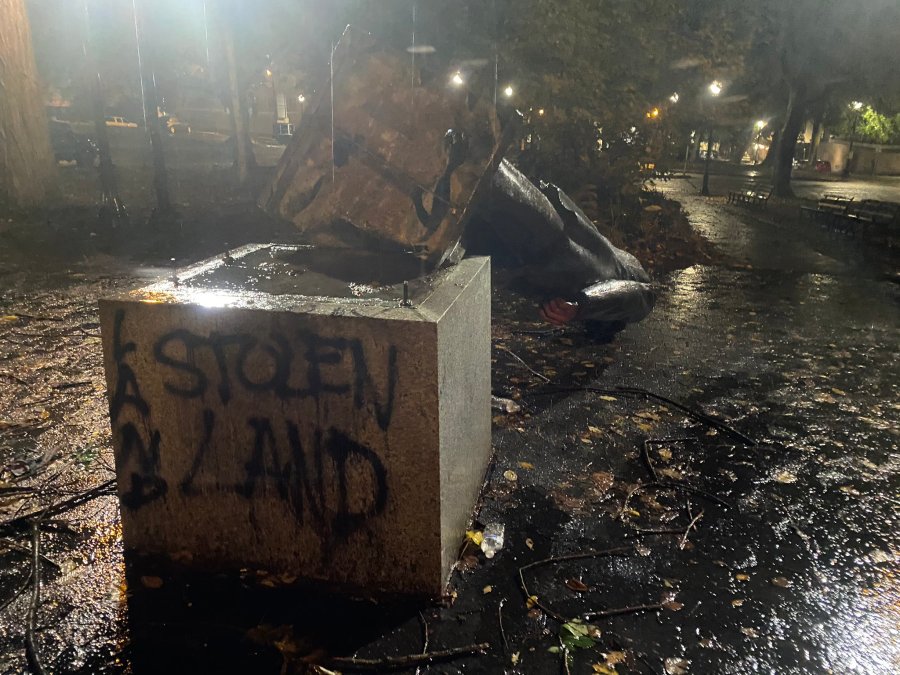 Multiple statues were spray-painted and toppled in the park blocks Sunday night. The windows and glass doors to the Oregon Historical Society were smashed out.