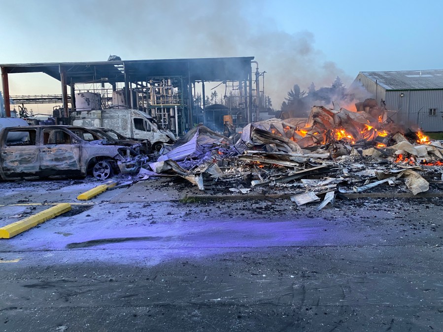 Firefighters said the fire was reported at 1:30 p.m. in the 500 block of N 4th Avenue where Thunderbolt Racing Fuel and Summit Foods are located. Crews arrived within minutes and found heavy smoke and flames coming from an area where ethanol racing fuel is processed and stored. Backup was called and firefighters started to work on extinguishing the flames but multiple explosions and “erratic fire conditions” led authorities to pull their teams back to a safe distance, Forest Grove Fire & Rescue said.