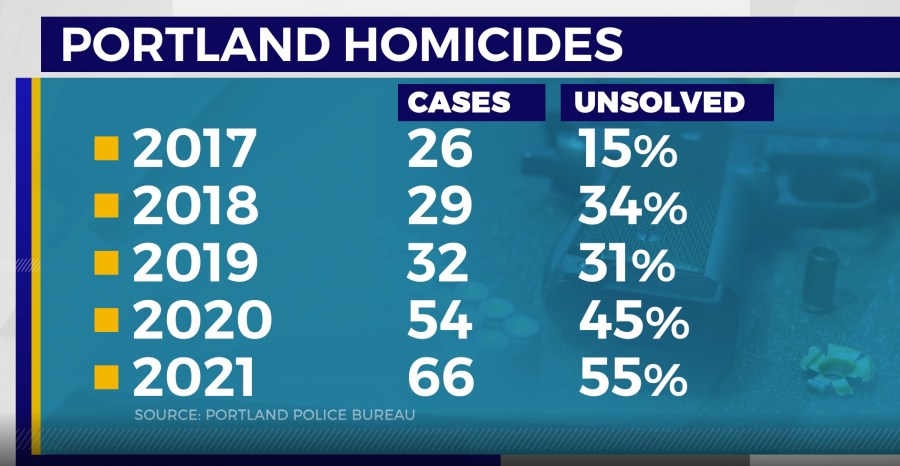 Police data shows homicides have more than doubled in Portland over the last five years. So far this year, the Portland Police Bureau has recorded a total of 66 homicides in the city. Detectives have solved 30 of those cases.