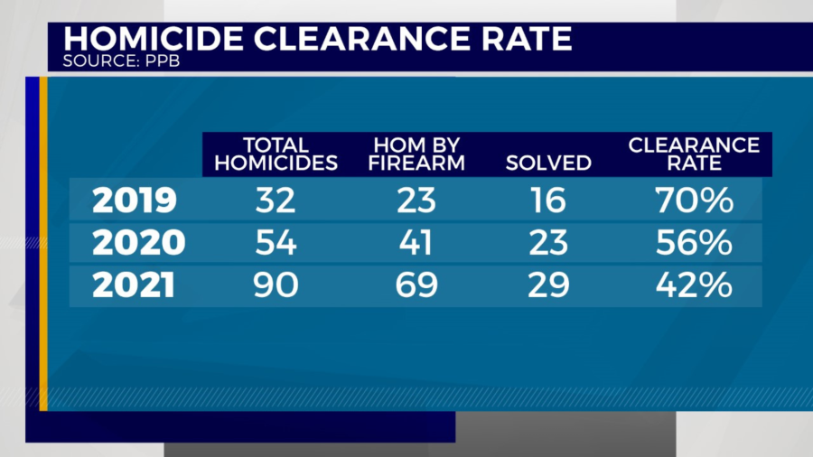 According to PPB, the homicide clearance rate was at 70% in 2019, decreasing to 56% in 2020 then 42% in 2021.