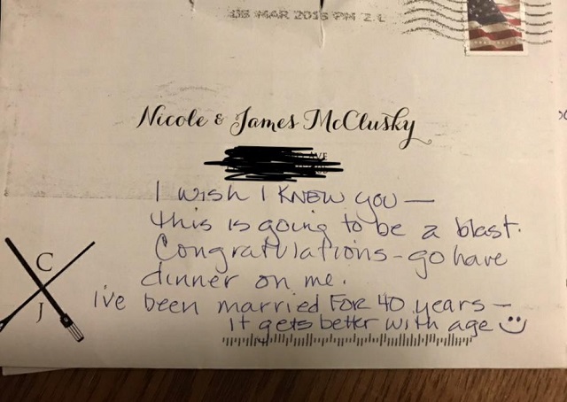 The stranger wrote on the front of the invitation, “I wish I knew you — this is going to be a blast. Congratulations — go have dinner on me. I’ve been married for 40 years. It gets better with age”