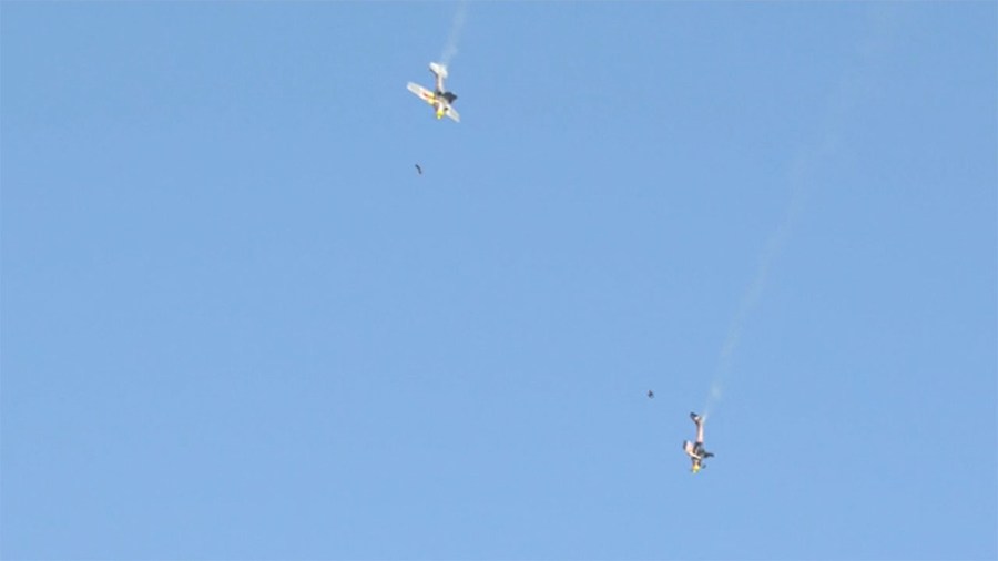 The pilots tried to swap planes while descending. One pilot landed without injuries after being forced to jump and parachute to the ground when one of the Cessna planes spun out of control.