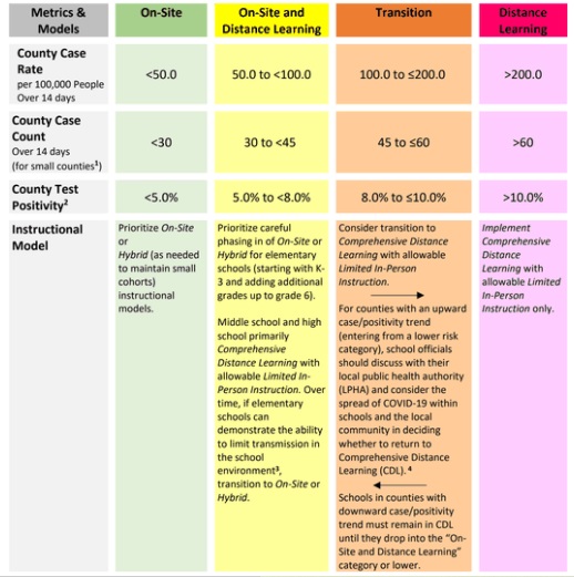 “The updates to our school metrics balance two priorities: more opportunities for in-person instruction when the risk is low & protecting the broader community from COVID-19,” Jeanne said. “While cases are rising – this week we reported two consecutive days of record high daily case counts including 600 today – we know the virus isn’t spreading as fast in every community and many counties have lower rates of positive COVID-19 tests than the state average.”