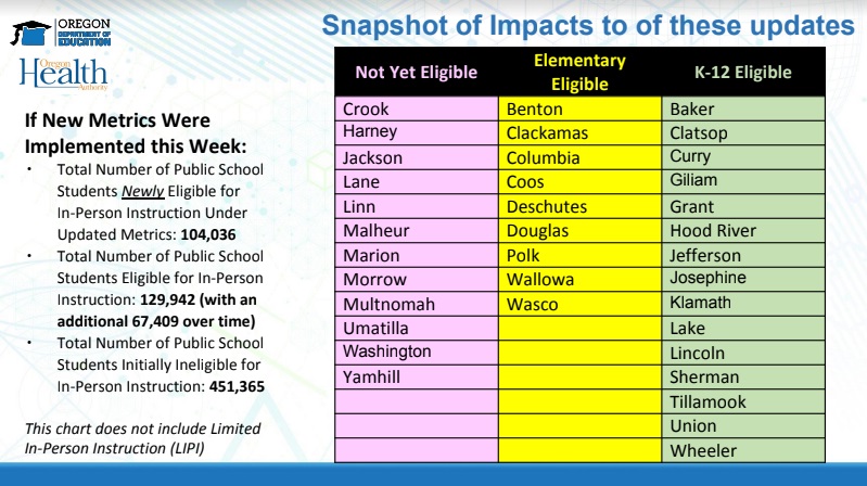 “We can be smart about minimizing risk while living our lives as safely as possible,” she continued. “Our updated metrics are based on the latest COVID-19 studies and data in line with CDC recommendations and bring Oregon in sync with other states like California. They also help us meet our priority of returning students to in-person instruction.”