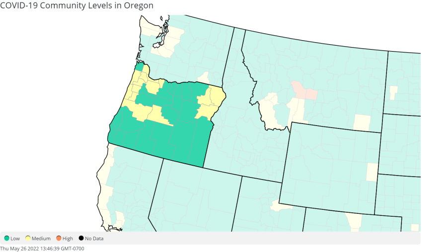Data from the Centers for Disease Control and Prevention's COVID-19 Community Levels tool shows where the virus is spreading the fastest in Oregon. (Courtesy/CDC)
