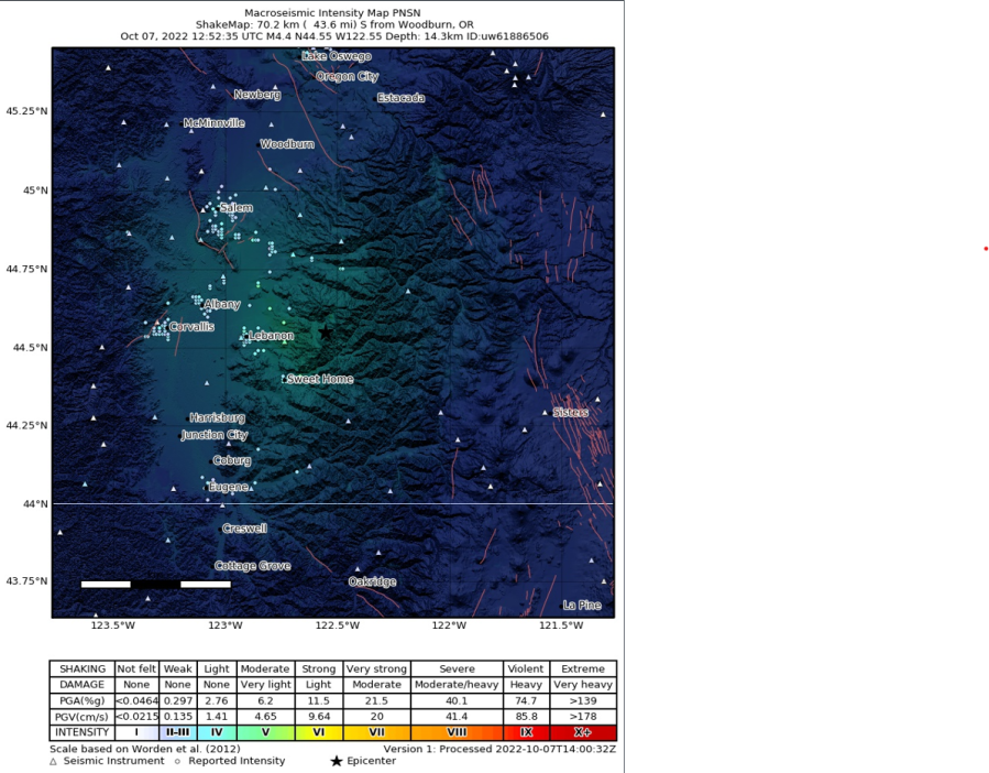 According to USGS historical records, Friday’s quake was one of six earthquakes of 4.4 magnitudes or larger to occur within the Willamette Valley since the late 1800s. The Willamette Valley’s earliest-recorded quake of this magnitude was a 5.0 recorded near McMinnville on April 2, 1896.