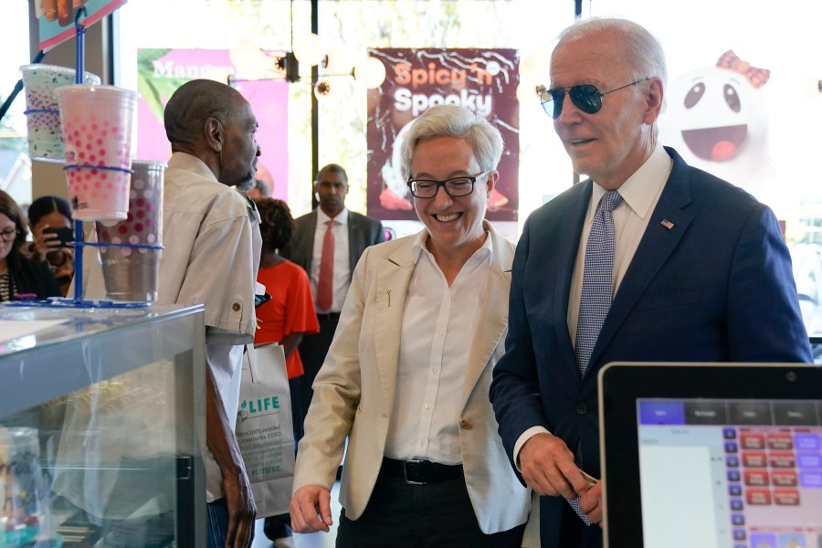 Biden was joined by Democratic gubernatorial candidate Tina Kotek, who he was also with Friday as he campaigned for her, only that time he had a box of Sesame Donuts.