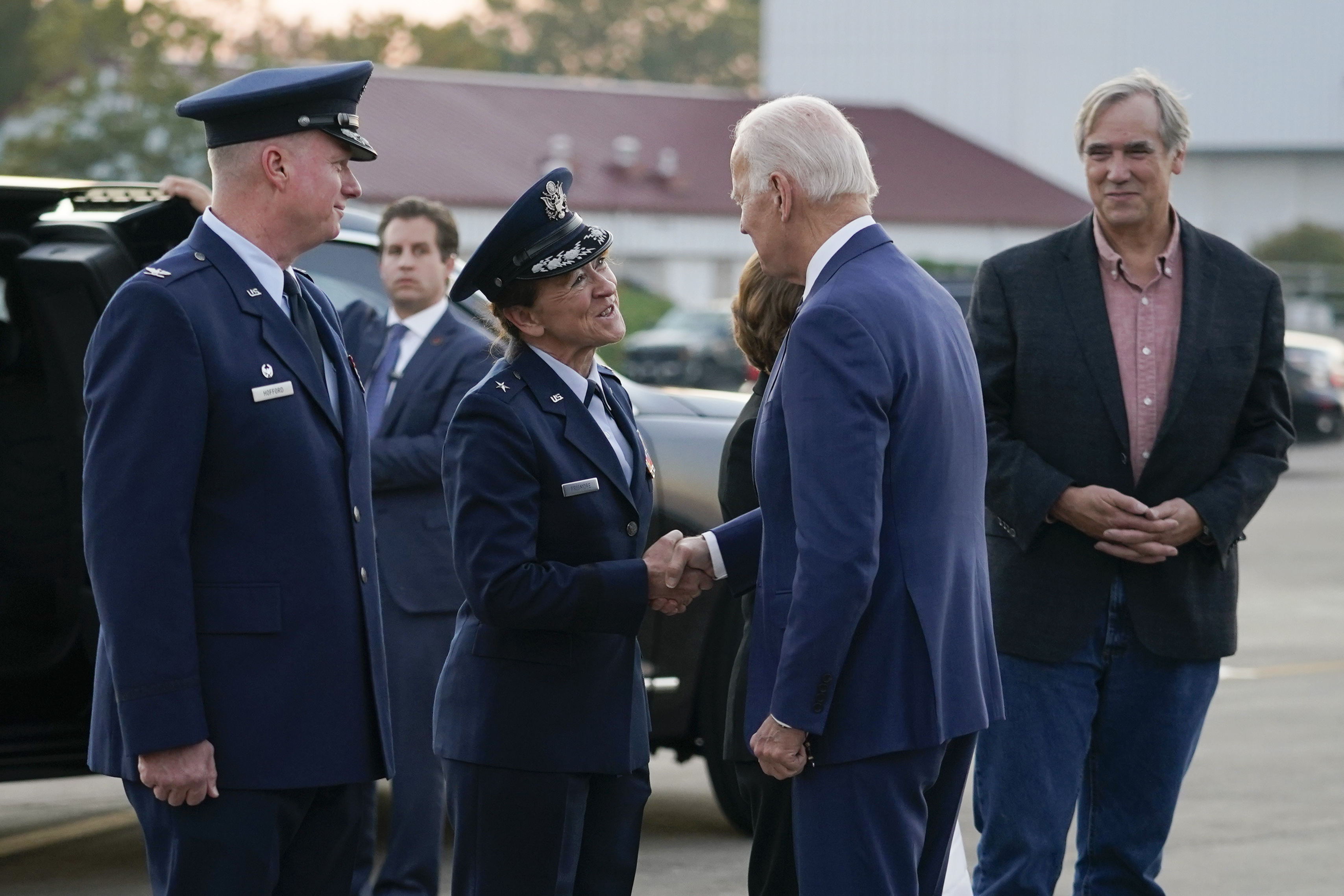 President Joe Biden shakes hands with Brig. Gen. Donna Prigmore, Commander, Oregon Air National Guard, second from left, as he arrives at Portland International Airport in Portland, Ore., Friday, Oct. 14, 2022. From left, Col. Todd A. Hofford, Commander, 142nd Air Wing, Prigmore, Biden, Rep. Suzanne Bonamici, D-Ore., obscured, and Sen. Jeff Merkley, D-Ore. (AP Photo/Carolyn Kaster)