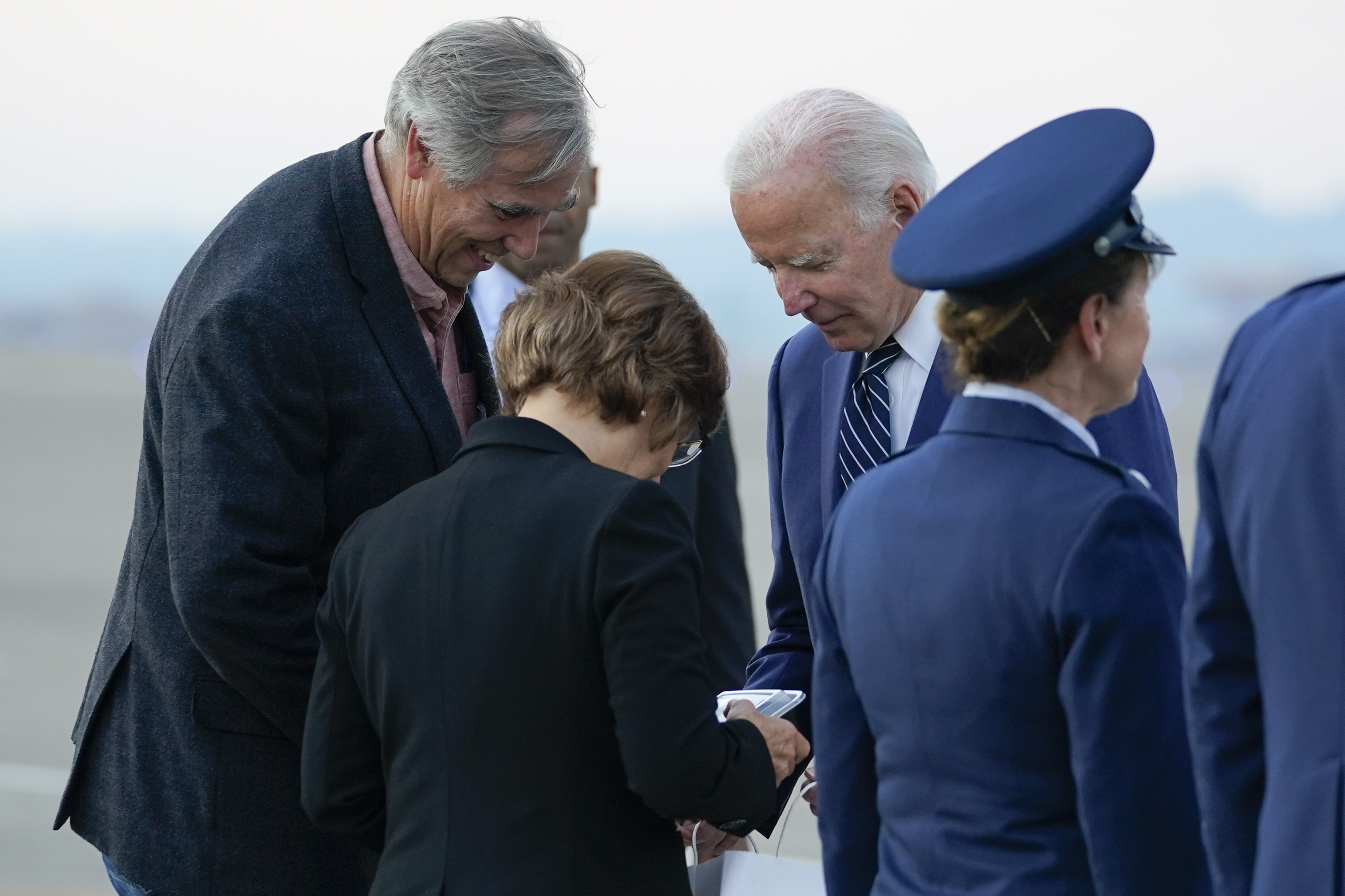 President Joe Biden is greeted as he arrives at Portland International Airport in Portland, Ore., Friday, Oct. 14, 2022. Sen. Jeff Merkley, D-Ore., is second from right. (AP Photo/Carolyn Kaster)