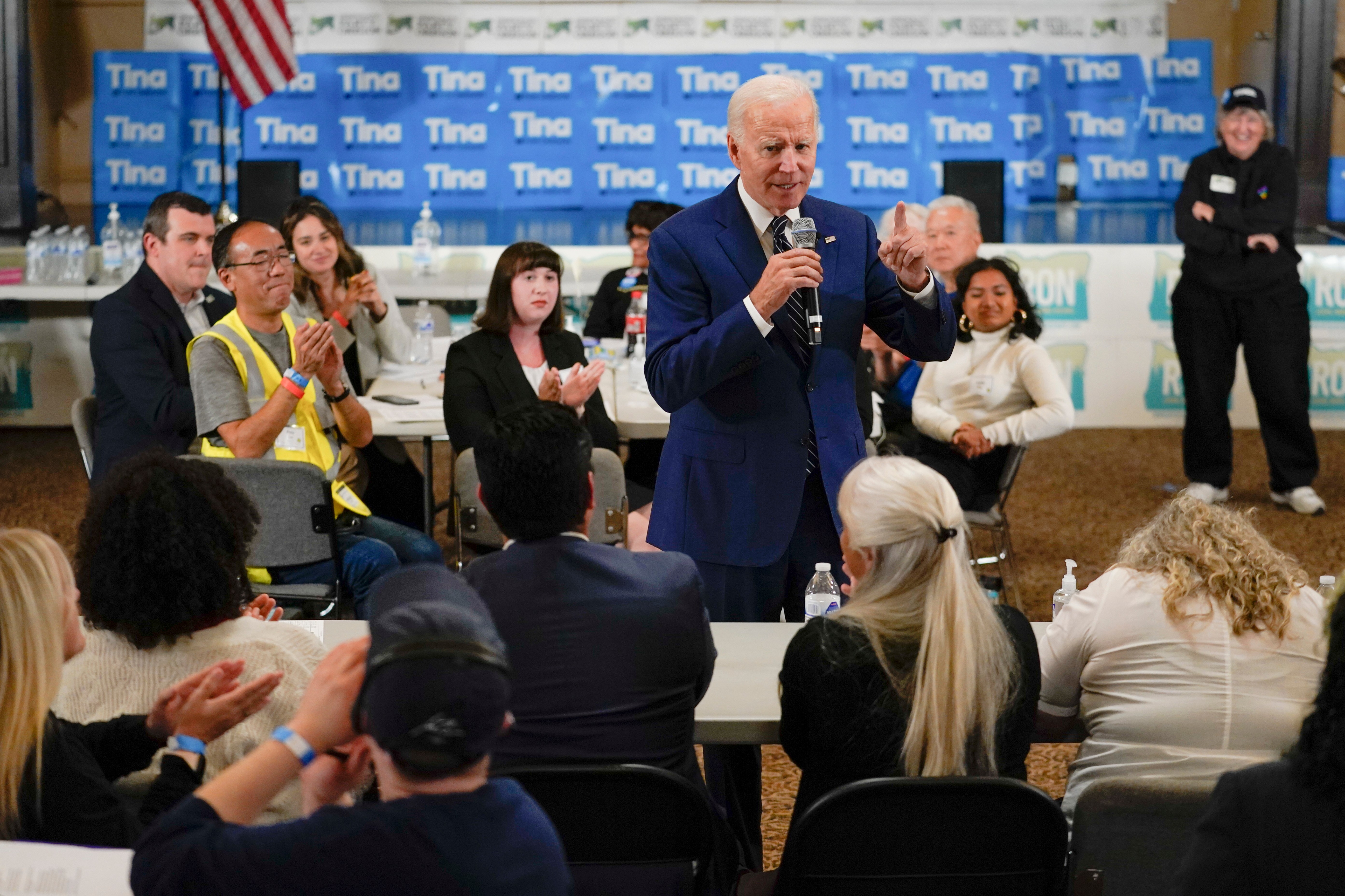 President Joe Biden stands with Tina Kotek, the Oregon Democratic nominee for governor, as he speaks during a grassroots volunteer event with the Oregon Democrats at the SEIU Local 49 in Portland, Ore. Friday, Oct. 14, 2022. (AP Photo/Carolyn Kaster)
