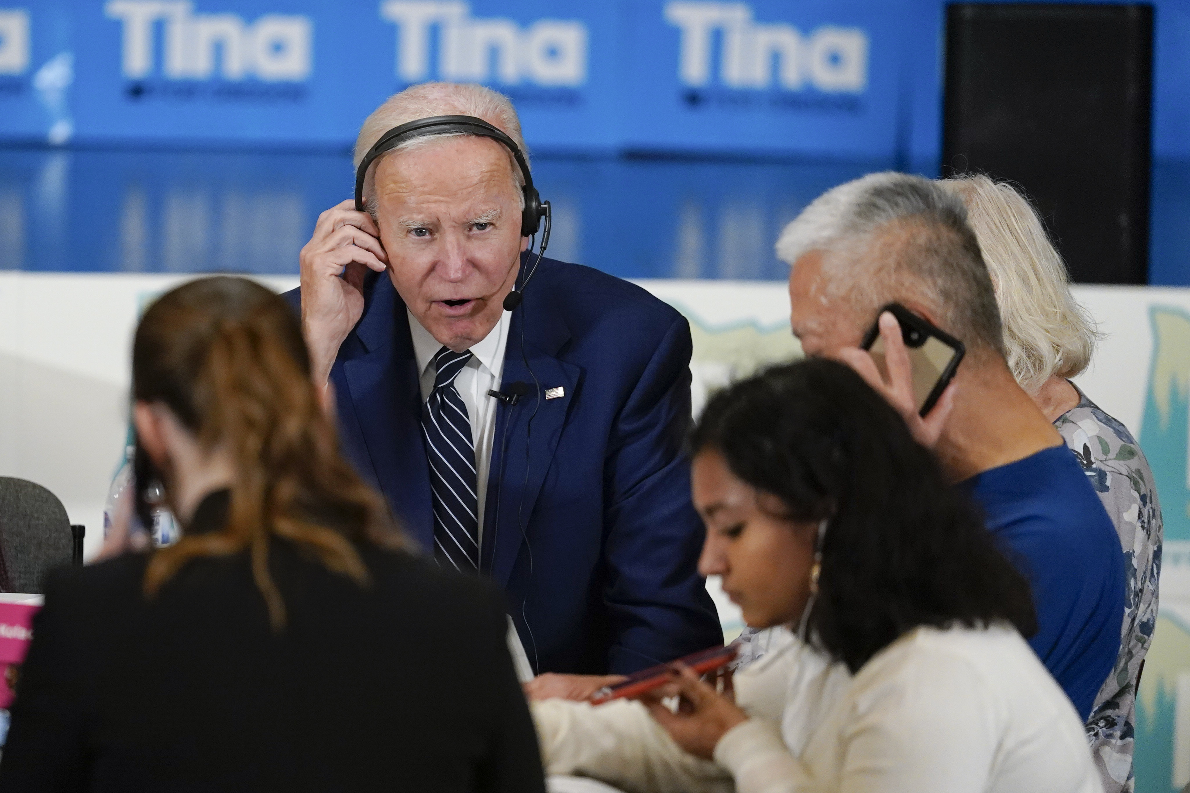 President Joe Biden works the phones during a grassroots volunteer event with the Oregon Democrats at the SEIU Local 49 in Portland, Ore. Friday, Oct. 14, 2022. (AP Photo/Carolyn Kaster)