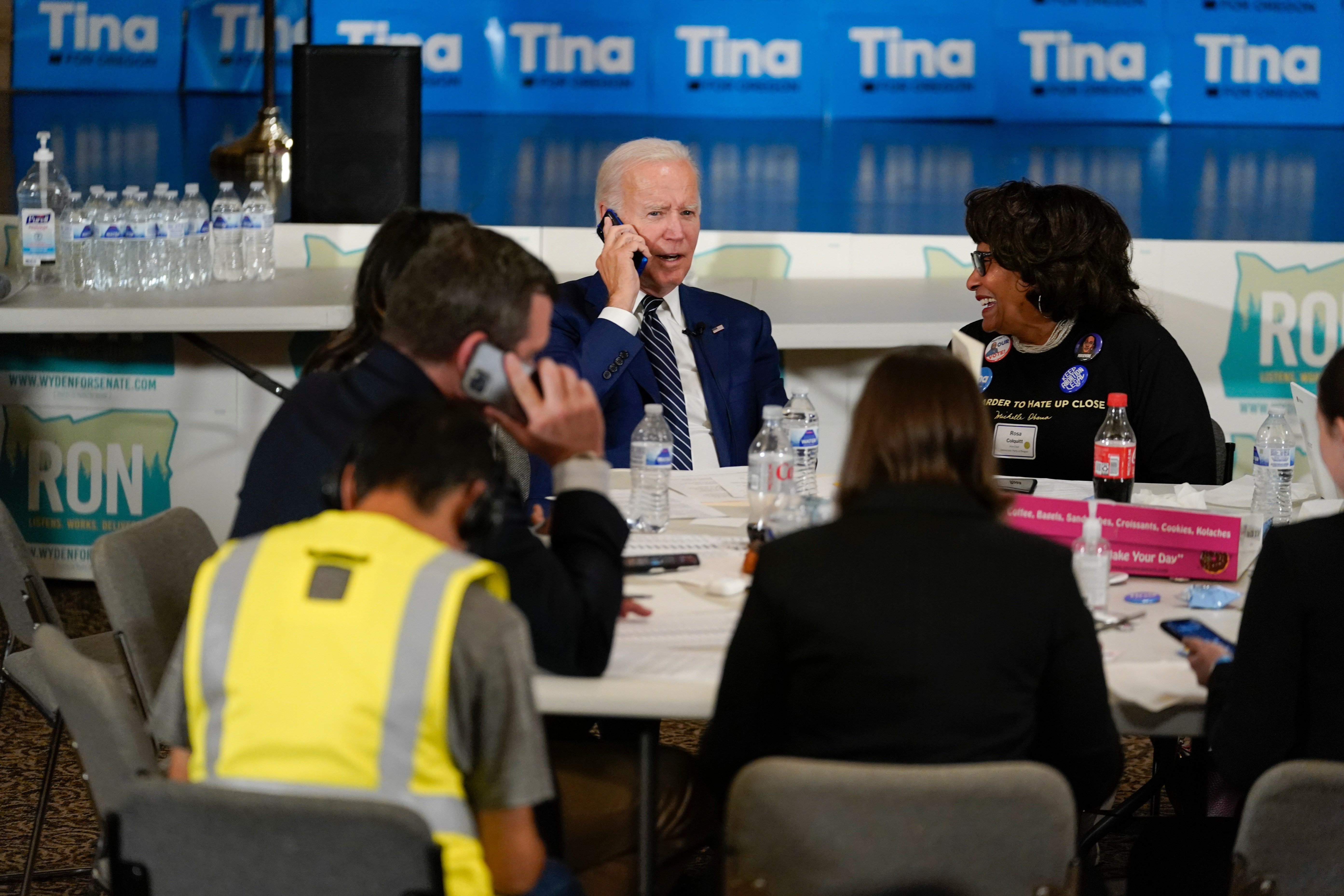 President Joe Biden works the phones during a grassroots volunteer event with the Oregon Democrats at the SEIU Local 49 in Portland, Ore. Friday, Oct. 14, 2022. Rosa Colquitt, Vice Chair Democratic Party of Oregon, is seated at right. (AP Photo/Carolyn Kaster)
