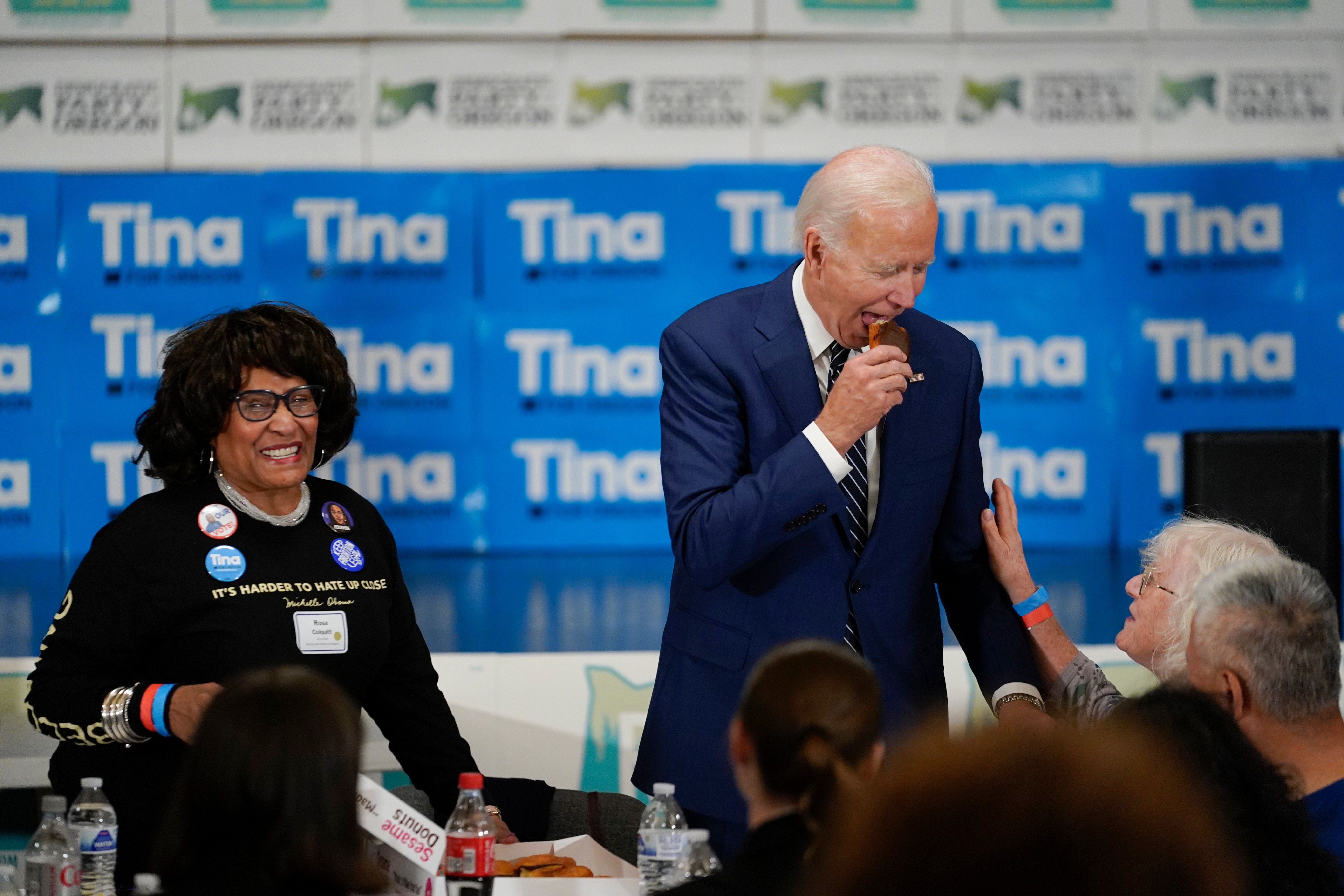 President Joe Biden eats a doughnut during a grassroots volunteer event with the Oregon Democrats at the SEIU Local 49 in Portland, Ore. Friday, Oct. 14, 2022. (AP Photo/Carolyn Kaster)