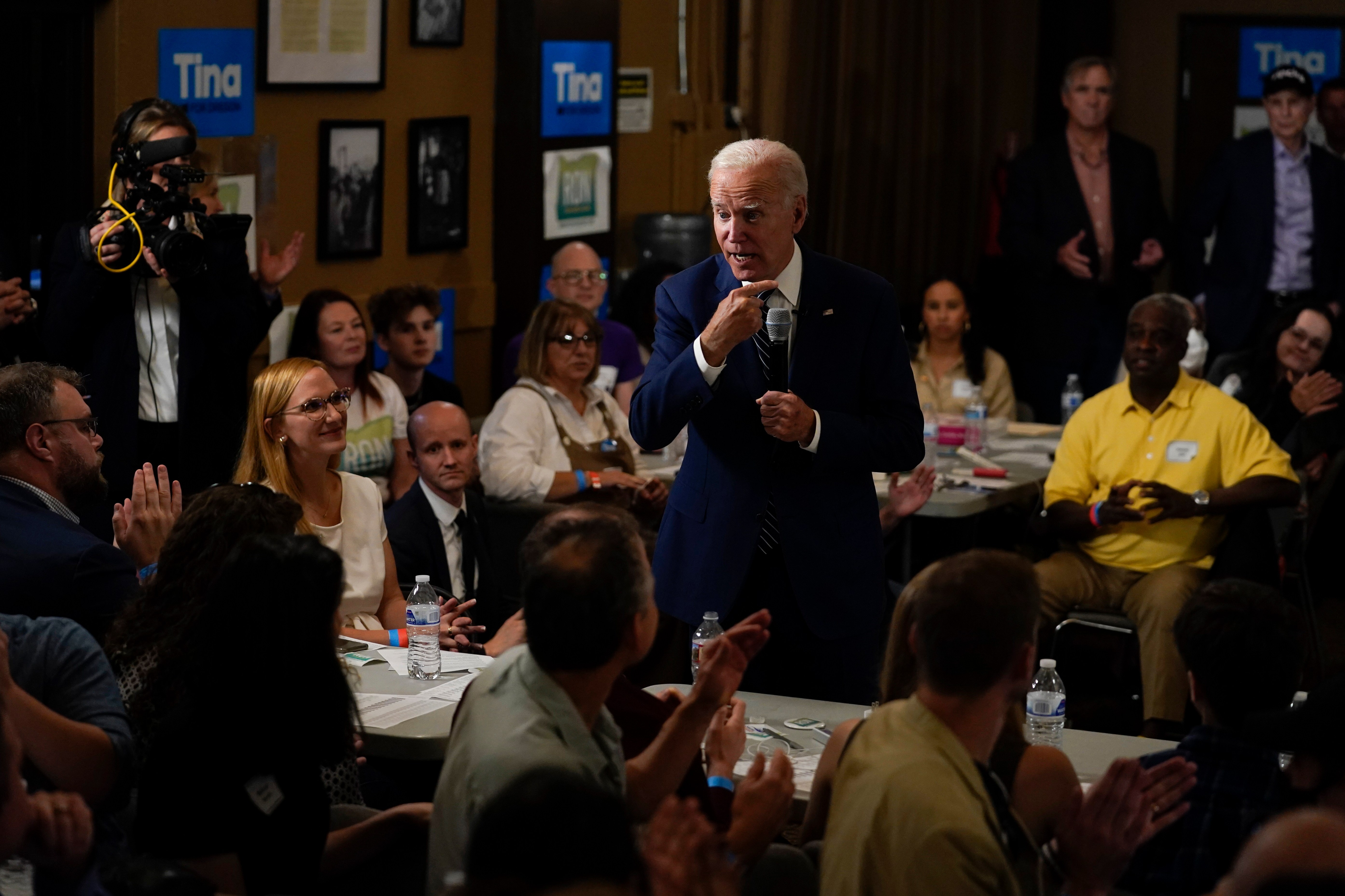 President Joe Biden is seated during a grassroots volunteer event with the Oregon Democrats at the SEIU Local 49 in Portland, Ore. Friday, Oct. 14, 2022. (AP Photo/Carolyn Kaster)