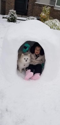 4-year-old Avaline with her Pomeranian, Momo inside an igloo in Hillsboro.