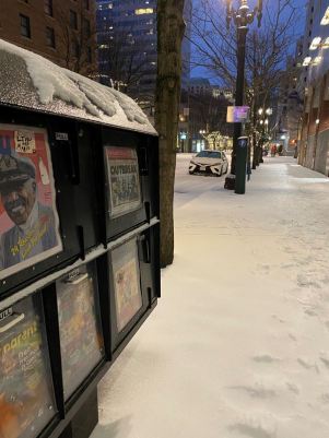 Snowy newspaper stands on 6th and Salmon in downtown Portland. Credit: Ryan