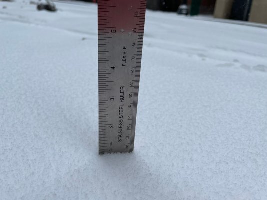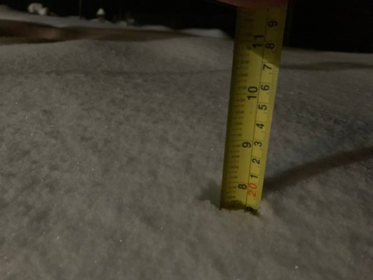 Snow measured outside the KOIN Tower on Feb. 12, 2021.