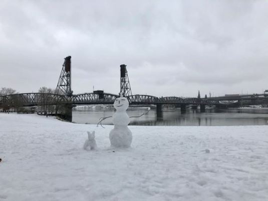 A snowman and snow corgi hanging on the Portland Waterfront. (Credit: Pauline Petersen)