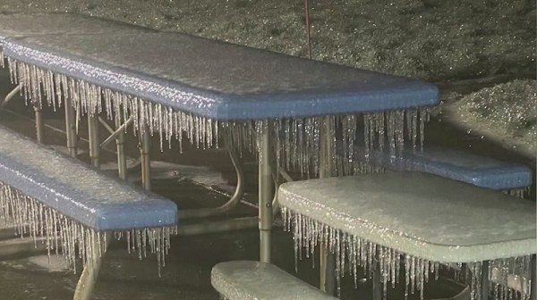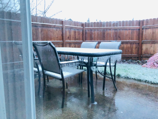 A backyard picnic table is coated in ice during a winter storm in Oregon, February 12, 2021 (Debra Garner)