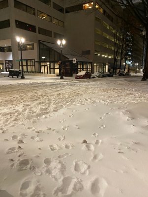 Snow in downtown Portland early Saturday morning, Feb. 13, 2021.