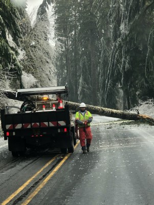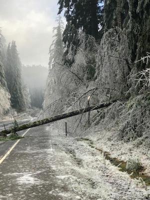 ODOT crews were on the scene of this downed tree on OR-18 in the Van Duzer Corridor. Feb. 13, 2021. (Oregon Department of Transportation)