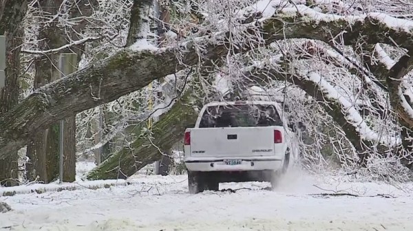 A giant tree blocks a road in Portland metro during a snow and ice storm, February 13, 2021 (KOIN)