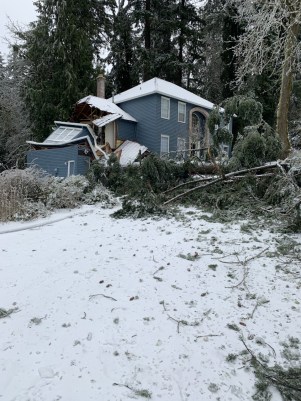 A home at top of hill in Lake Oswego on Aspen Street was badly damaged in Saturday’s storm. The resident was reportedly taken to a nearby hospital where his condition is unknown (Adam Bjaranson/KOIN)