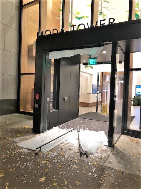 At the nearby Moda Tower, the enormous glass front doors were reduced to a pile of shards. A witness said the group used a hammer to break them. The windows of a dentist’s office across the street met similar fates.