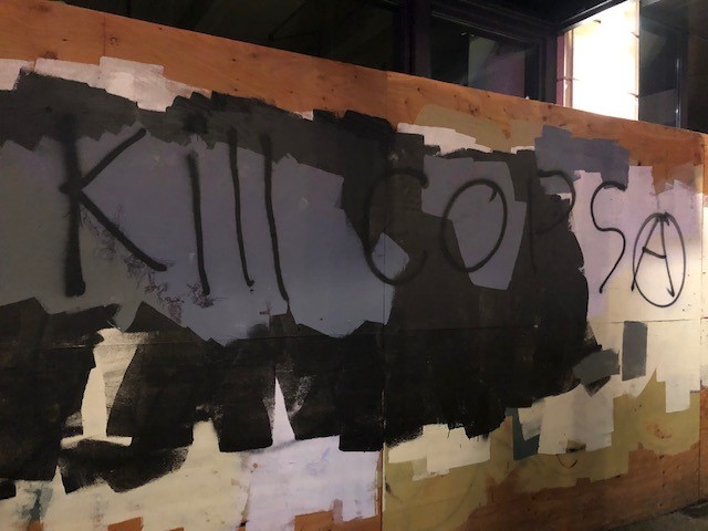 The vandals spray-painted violent messages like “kill cops” and “anarchy means attack.”