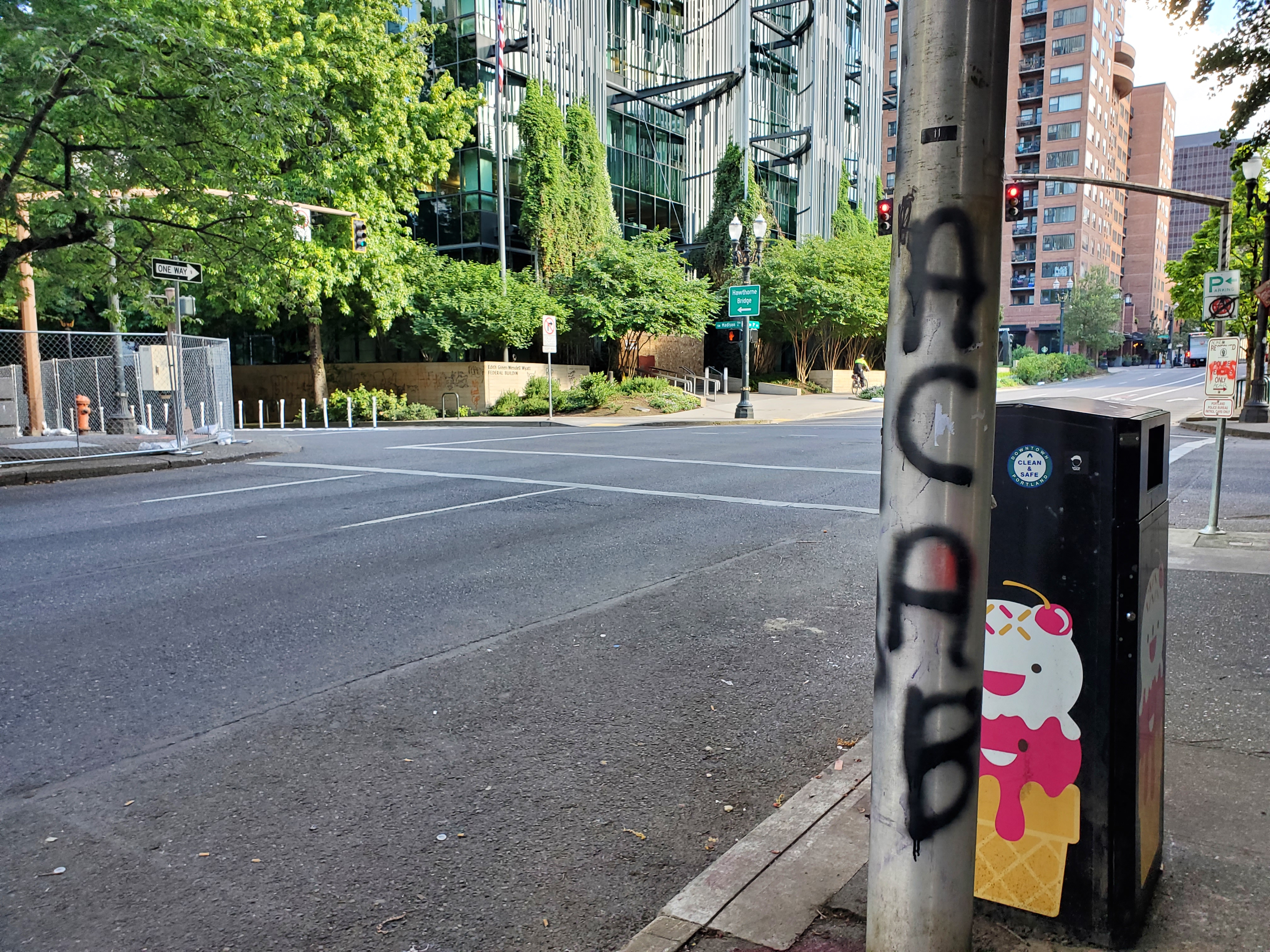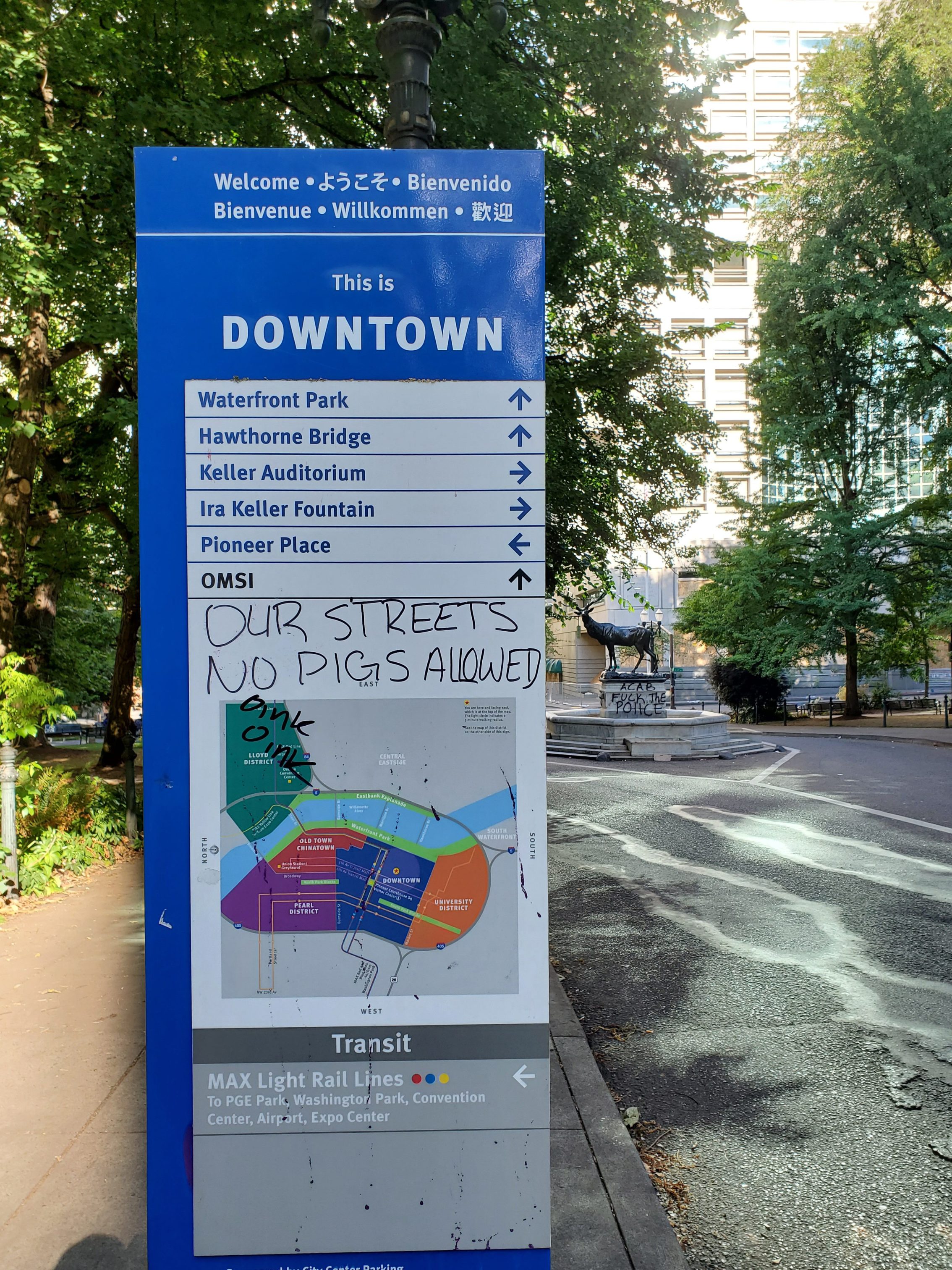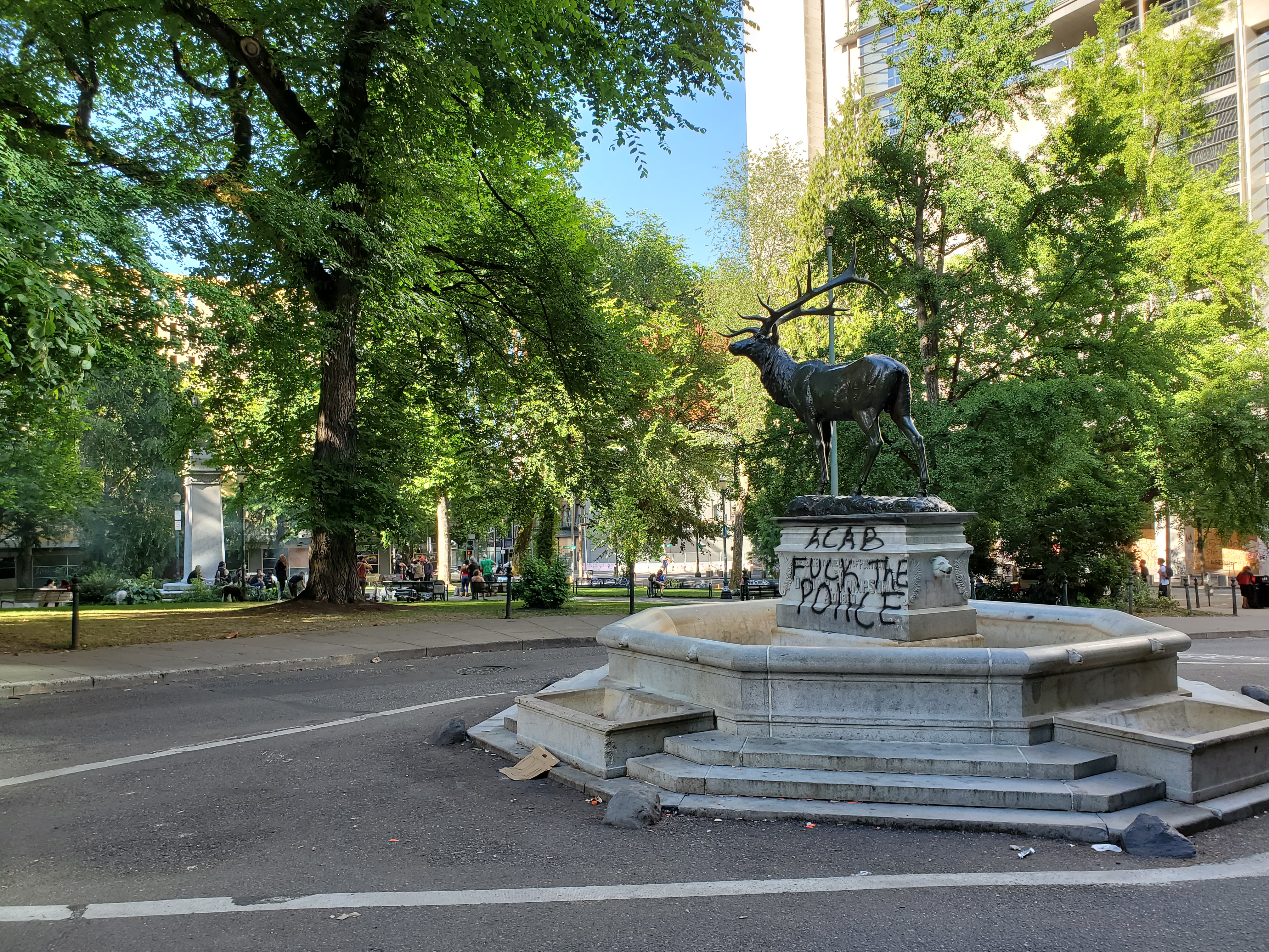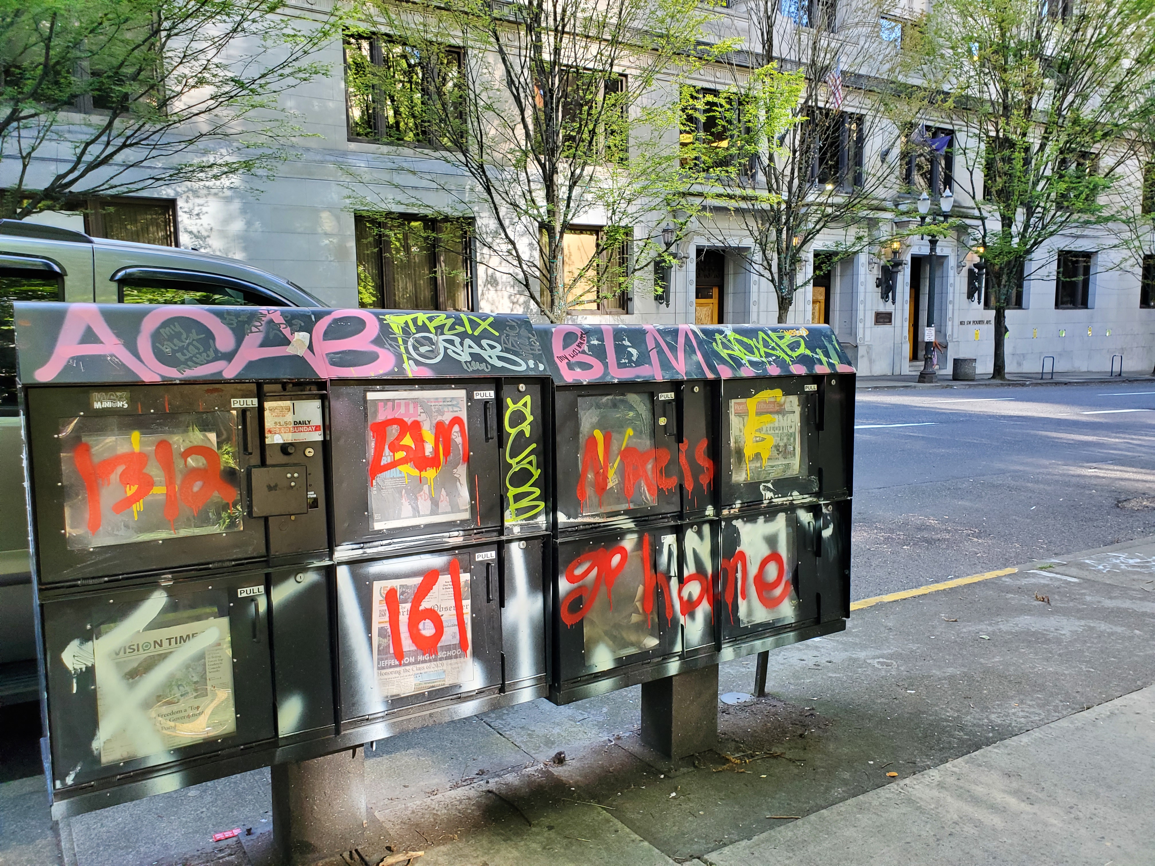 Although largely uneventful, downtown demonstrators stuck around until the late hours of the night as some participated in unruly behavior. By 10 p.m., a crowd of a few hundred people was gathered in downtown blocks surrounding the Justice Center and Portland Police Bureau’s Central Precinct. At one point shortly before 10 p.m., protesters had burned an American flag while chanting “F— this flag.”