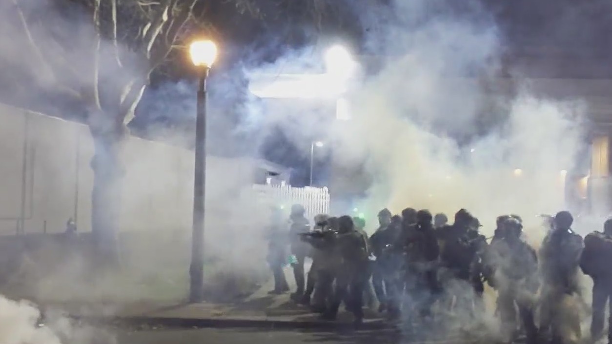PORTLAND, Ore. (KOIN) — The 4 expected Inauguration Day protests in Portland all took place. Two of them were peaceful and caused no issues. The other 2 caused considerable damage and ended with 14 arrests and federal officers tear gassing the group who had vandalized the ICE facility.