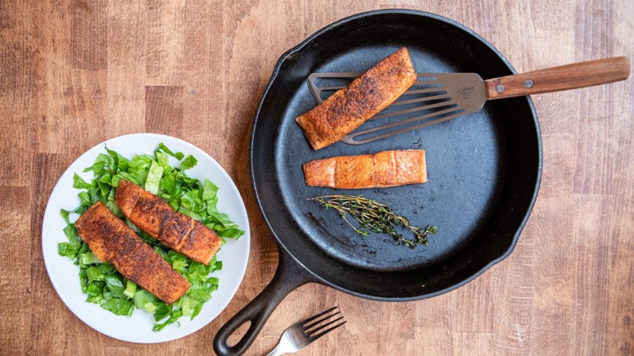 Most fish is not cooked over high heat, but the pan itself can become hotter than the food. You’ll need a fish spatula that can take the heat. Metal is the obvious choice, and silicone is in a pinch. If you use a plastic or nylon fish flipper, check to make sure it is rated for the temperature you’re using.