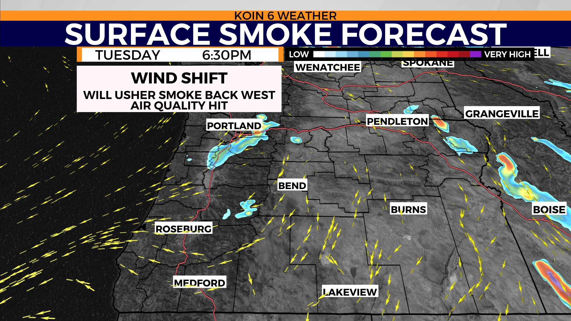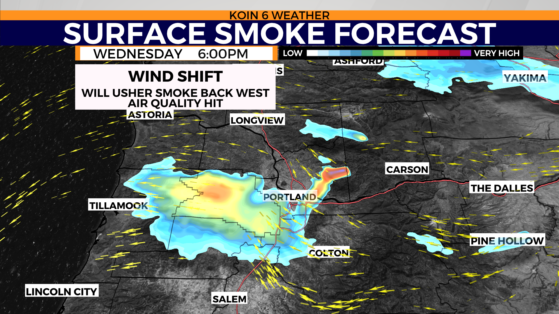 The surface smoke forecast will give an idea of the distribution of that smoke in our region come Tuesday evening. You can use the slideshow below to see what that will look like come Wednesday. This doesn’t take into consideration the wildfire smoke that is moving across the region from other nearby wildfires.