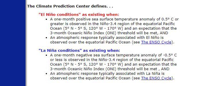 Below is an example of a SST Anomalies chart, which will help depict El Niño or La Niño conditions. What is a SST anomaly? First, sea surface temperature is the temperature of the top millimeter of the ocean’s surface. When we look at anomalies, we tend to use long-term information, such as 30 years. However, to determine sea surface temperature anomalies for ENSO cycles, they come at irregular intervals (roughly every 3-6 years).
