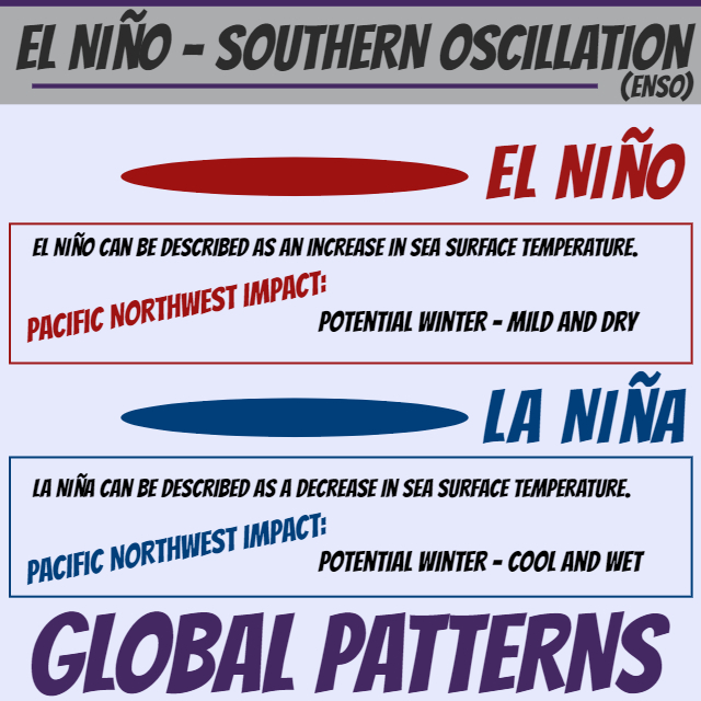 As you’ve learned, El Niño and La Niña are opposite phases, and can each impact large-scale ocean processes and global weather and climate. That is why this lesson is about global patterns: