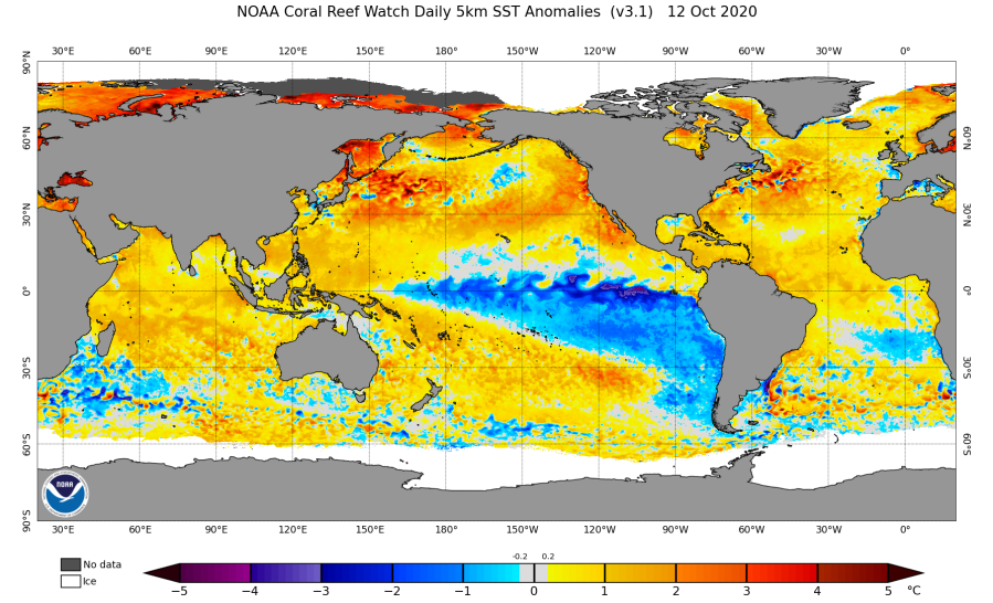 The surface waters across a large swath of the tropical Pacific Ocean warm or cool by anywhere from 1°C to 3°C, compared to normal.