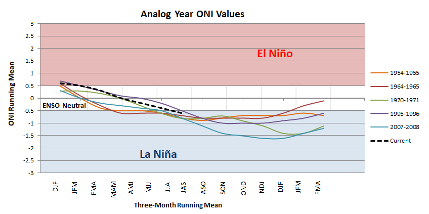 I also took a closer look at five specific La Niña winters for more hints this winter. I call this set my analog years, since they most closely resemble our current ENSO pattern based off of our current Oceanic Nino Index (ONI).