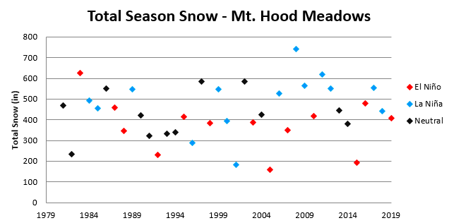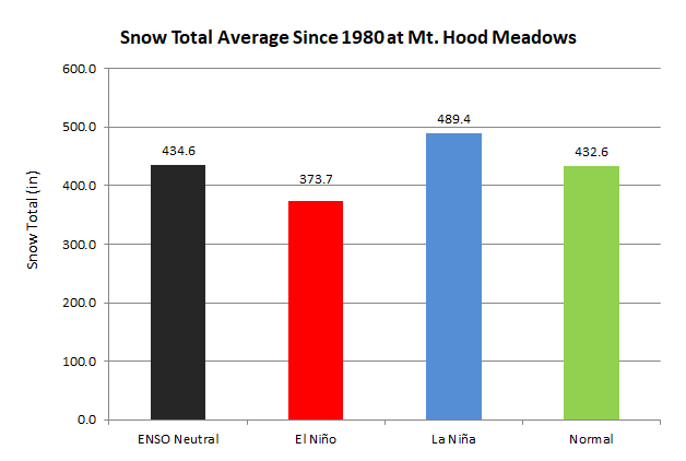 La Niña winter years have historically given above-normal snowfall throughout the winter seasons. Data provided by Mt. Hood Meadows shows seasonal snowfall since 1980 with average yearly snowfall around 430 inches above 5,000 feet. Notice how the past seven La Niña seasons have provided above-normal snow in the Cascades.