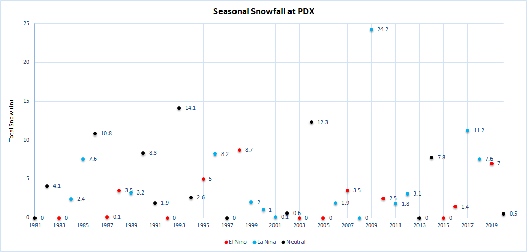 To get a better hint about snowfall in Portland this winter, I spent some time looking at previous La Niña patterns since the 1960s. Take a look at seasonal snowfall in Portland over the last 40 years, since 1980.