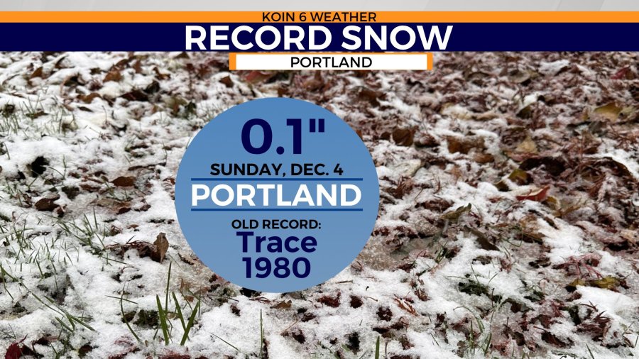 PORTLAND, Ore. (KOIN) — The Portland metro area’s first snowfall of the season set a record for Dec. 4, with an official tenth of an inch recorded at Portland International Airport.