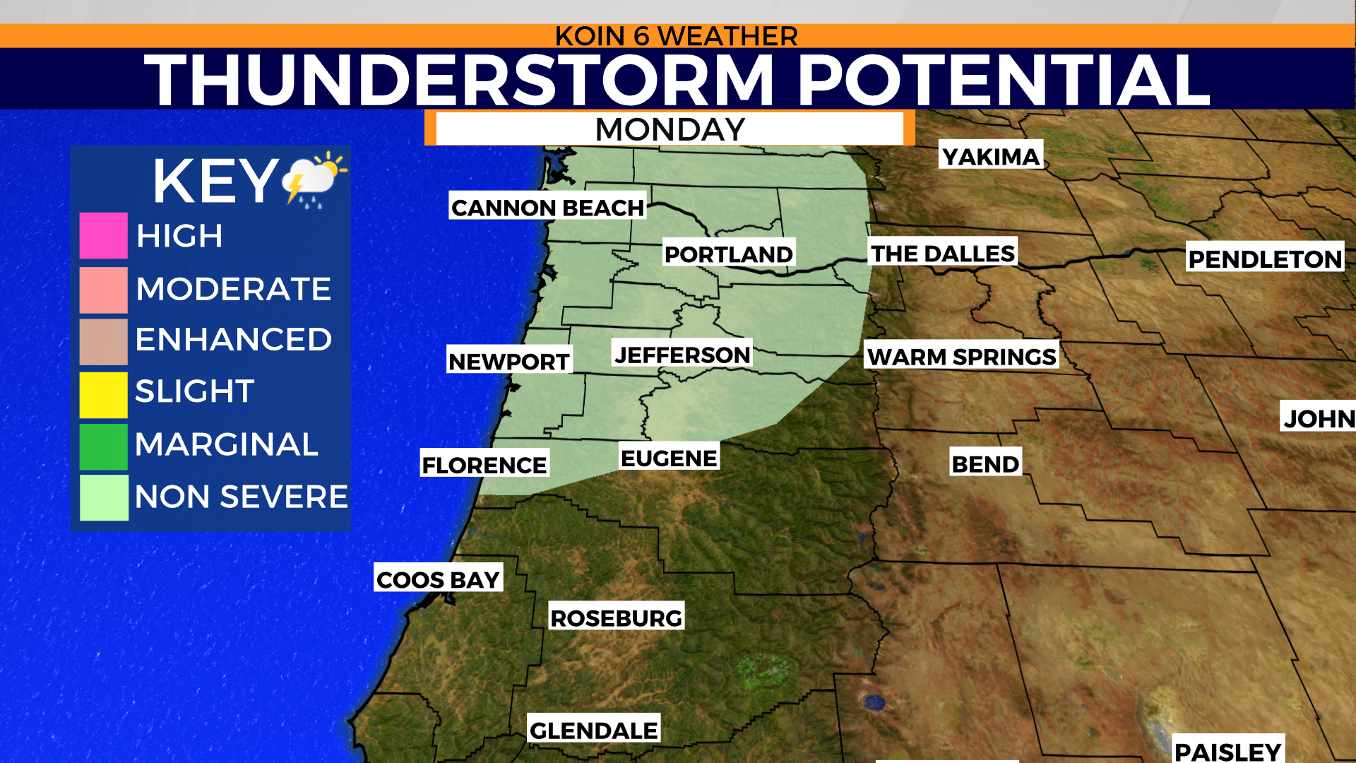 PORTLAND, Ore. (KOIN) — Thunderstorm activity is possible Monday afternoon as winds continue to increase across western Oregon and Washington. No severe weather is expected, but a chance for a rumble of thunder or two is possible.