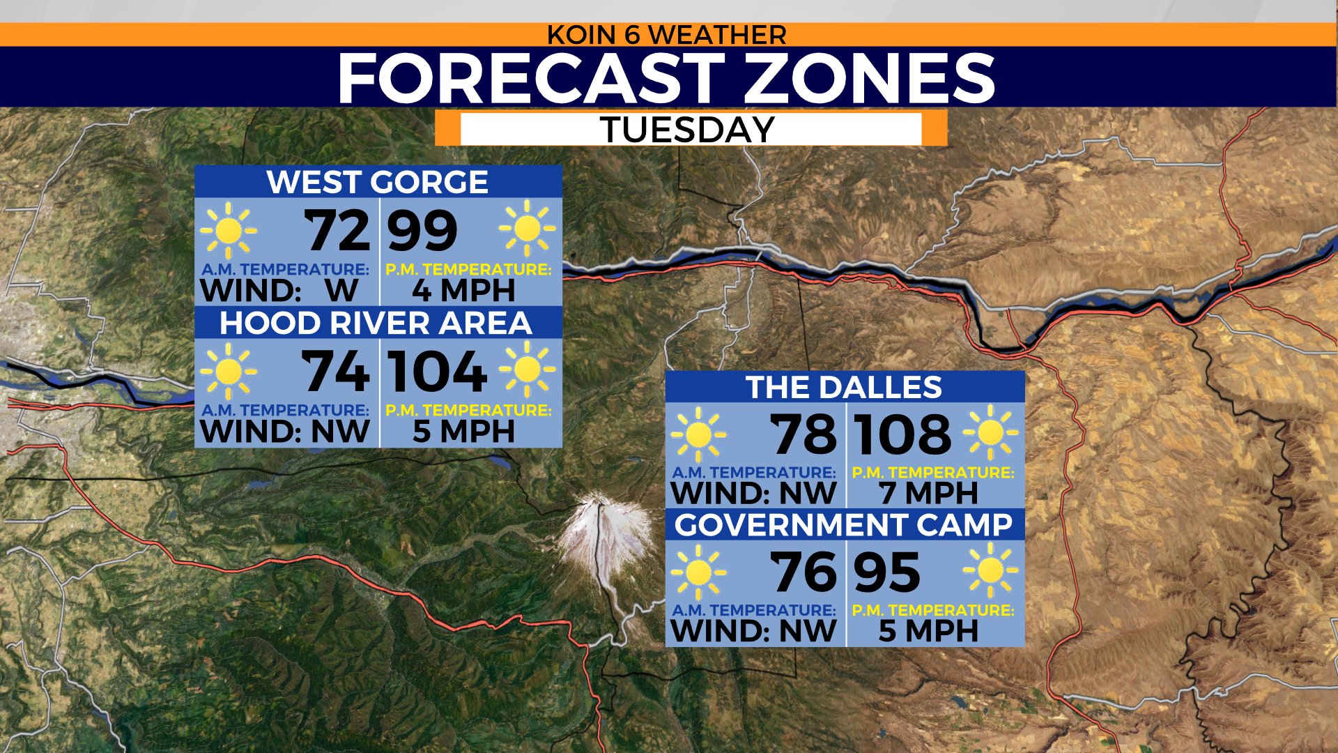 Make sure you have that water bottle filled up and a backup plan if you have any issues with staying cool. Do not expect temperatures to be much cooler if you are going east. Temperatures expected to be near the triple-digits or warmer from Troutdale to Pendleton. The Dalles may jump up to the 108 range for a second day in a row.