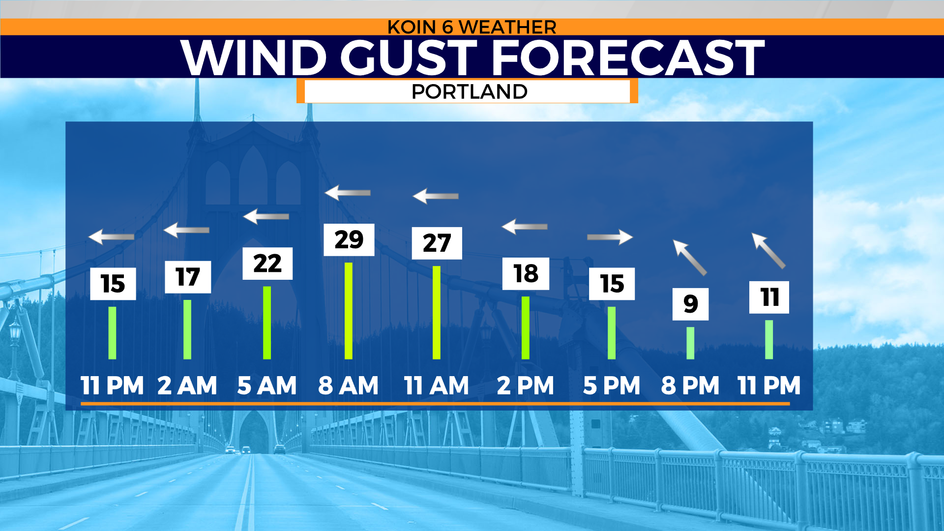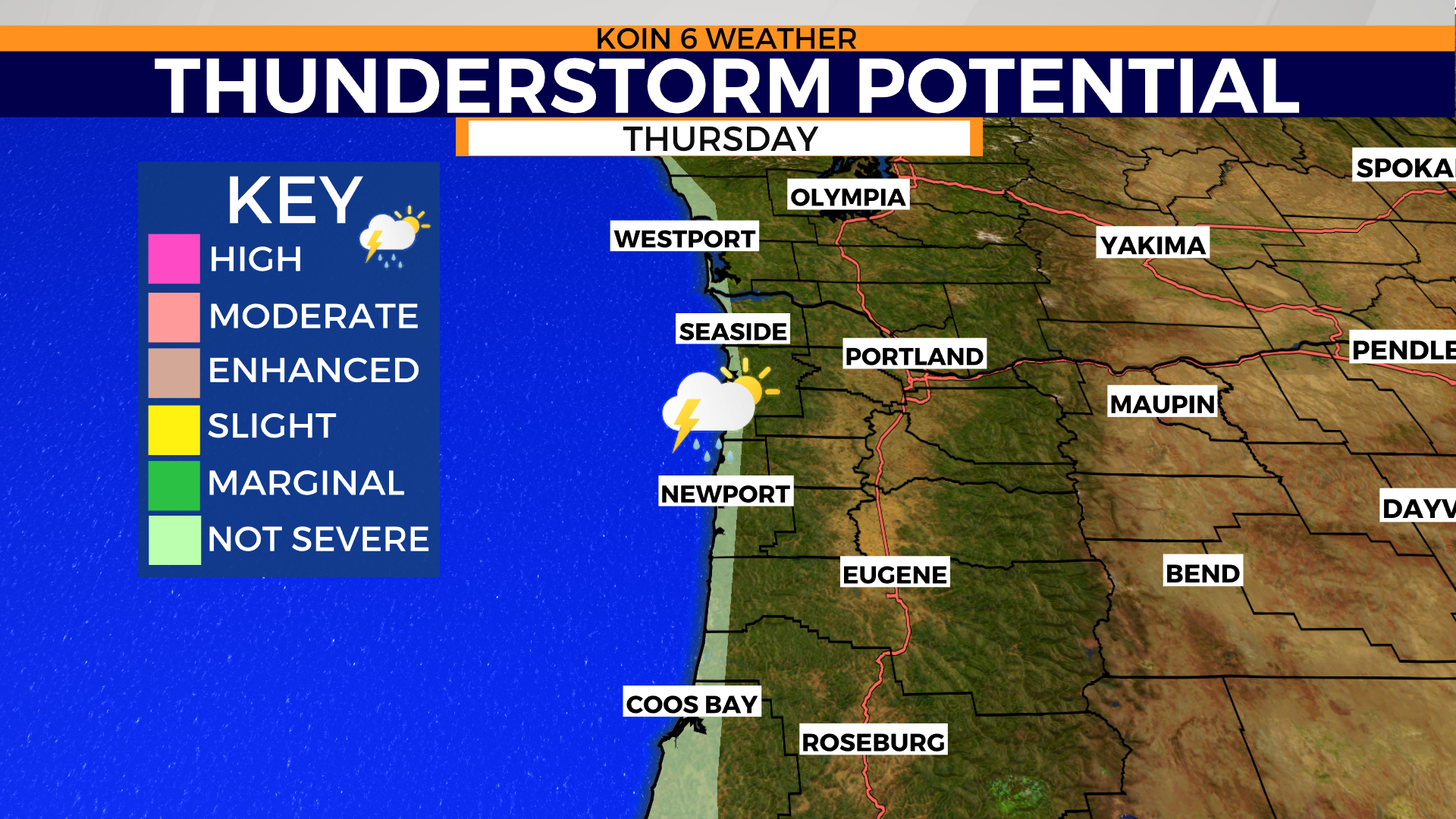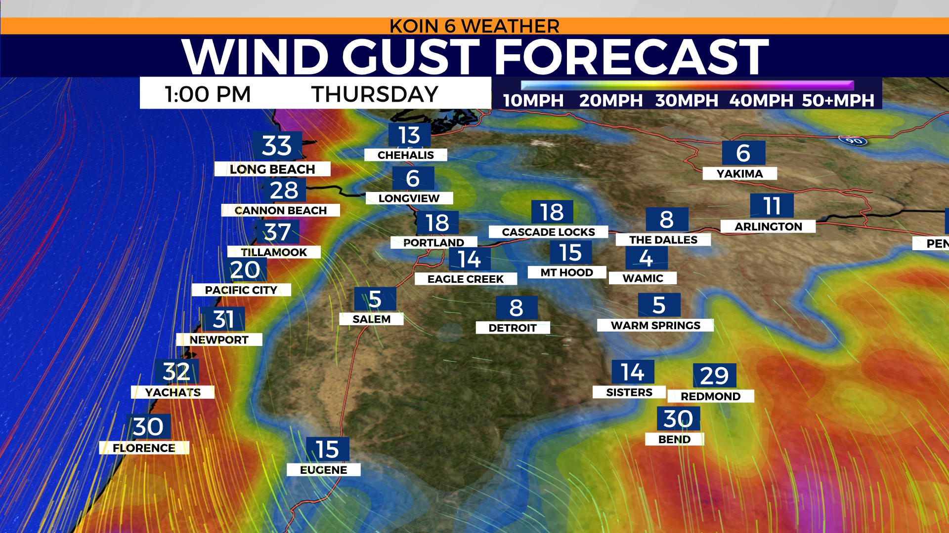 Peak gusts for the northern Oregon coast near Tillamook/Cannon Beach may experience gusts up to 35-40 mph from 11 a.m. to 3 p.m. roughly. There is a chance for thunderstorms at the coast this afternoon and evening.
