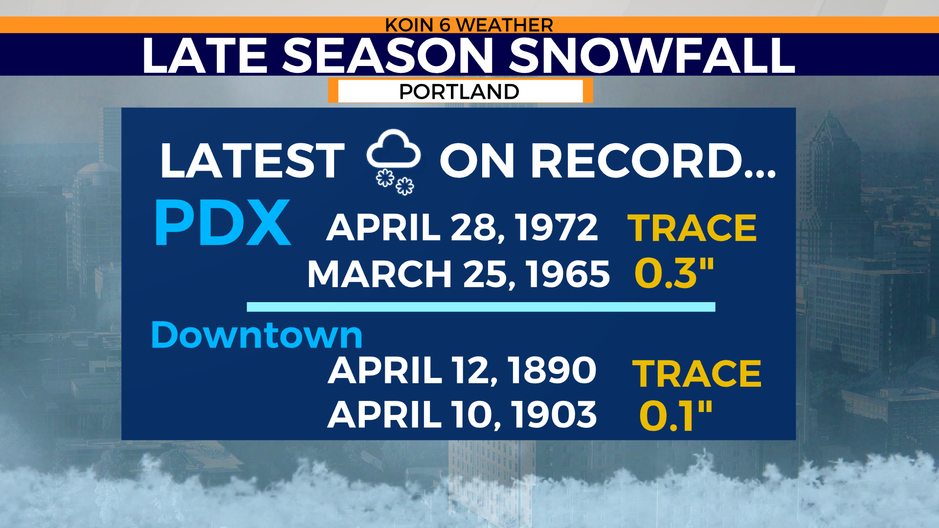 Late measurable snow:Airport: March 25th, 1965 at 0.3″. Downtown: April 10th, 1903 at 0.1″