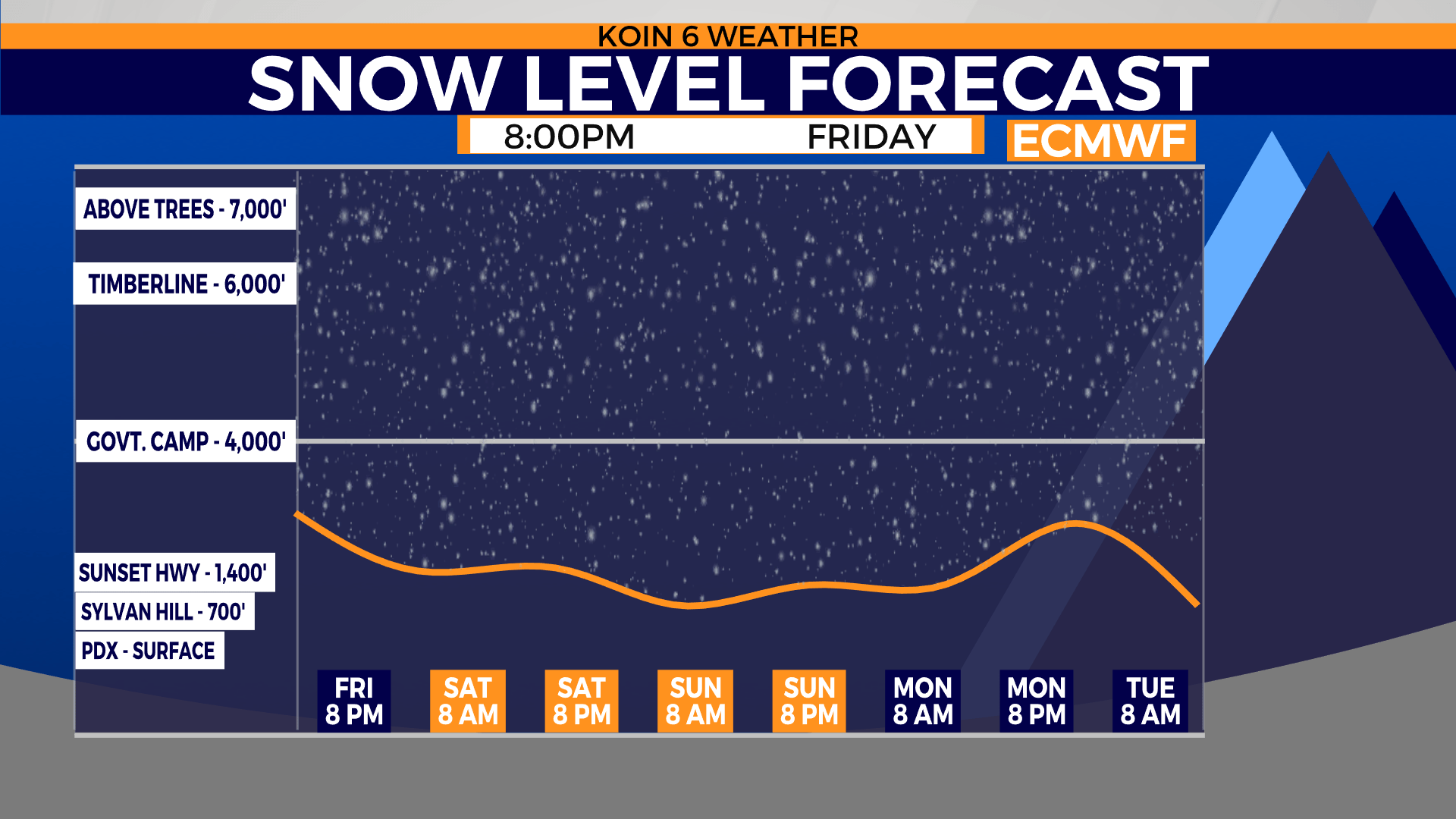 Lower snow reality check: the snow for the hillsides isn’t going to survive daytime temps in the upper 40’s. Any low snow will only be there for the moment of the heaviest showers and the coldest part of the night/morning.