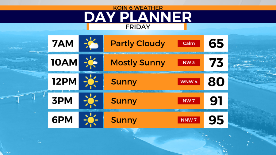 Friday morning is our last breath of cool ocean air pushing onshore. Expecting clouds to linger at the coast after sunrise and partly cloudy skies prevail in the valley this morning. The morning temperatures are a tad warm to start. Mid 60’s PDX. The record highest minimum temperature aka warm low for this day is 64.