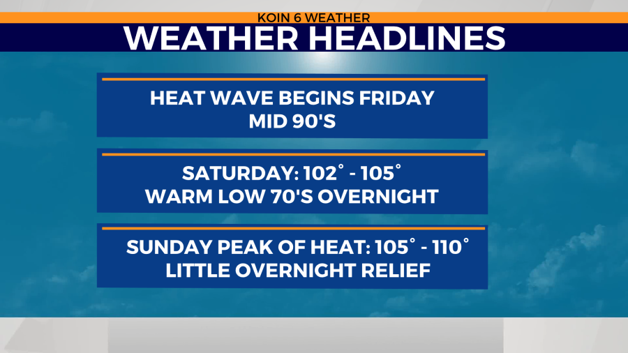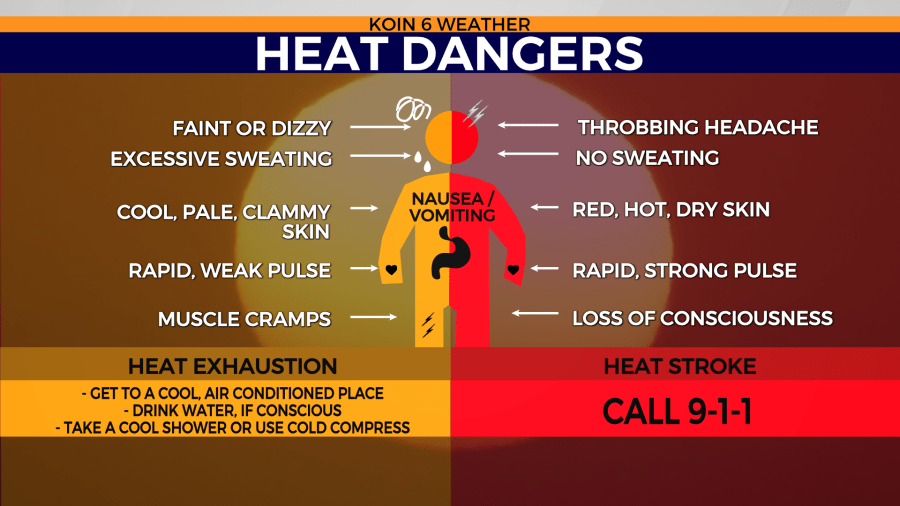 Emphasizing warm nights, we could be breaking records night and day. Overnight lows could match our “normal” daytime high, which is 76. The extreme heat continues Monday, with a daytime high as hot as 107, or worse up to 110.