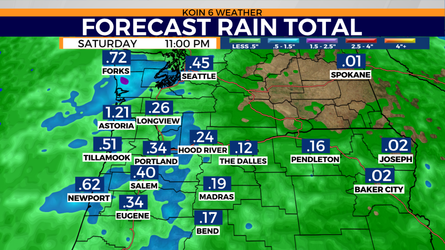 Saturday: A cold front arrives with rain and breezy conditions. Showers stay with us for the morning and afternoon with a few dry breaks. High temperatures reach the upper 50’s. There is a chance for isolated thunderstorms, mostly near the Oregon coast and coast range from Newport south to California.