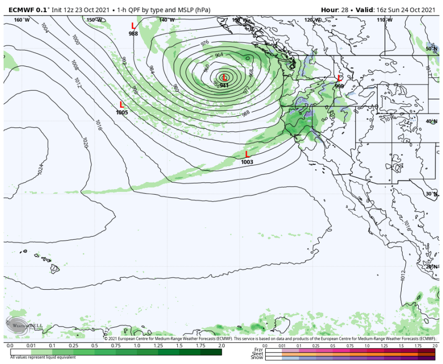 Sunday: This is the day when rapid strengthening of Bomb Cyclone #2 reaches its lowest minimum pressure. While the exact path is uncertain, I can say with reasonable confidence that impacts will be felt from the coast of southern Oregon all the way up to Vancouver Island, British Columbia. This is the 2nd storm of its kind in one week. If you’re thinking this sounds extreme for the Pacific Northwest, you’d be right.